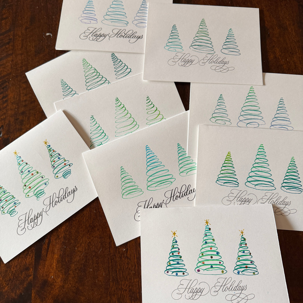 Celebrate the blessed season of Hanukkah with this curated collection of five elegant greeting cards, each adorned with exquisite hand-lettered copperplate style calligraphy by Jaclyn Drexel. One special card will be decorated, with a calligraphers special touch featuring multi-colored hombre flourished trees using color shifting ink for the star and ornaments. The base of the card is printed on 110 lb. card stock in A2 format. These cards feature four festive sentiments—Happy Holidays, Happy Hanukkah, Peace on Earth, with penguins, deer and snowflakes gracing the front covers while the leaving interiors pristine for your personal message. Each card arrives paired with a 4.25" x 5.5" coordinating white matte square-flap A2 envelope. Perfect for those who appreciate refined stationery and artistic detail. Designs and colors will vary-while we cannot guarantee each card will be identical.