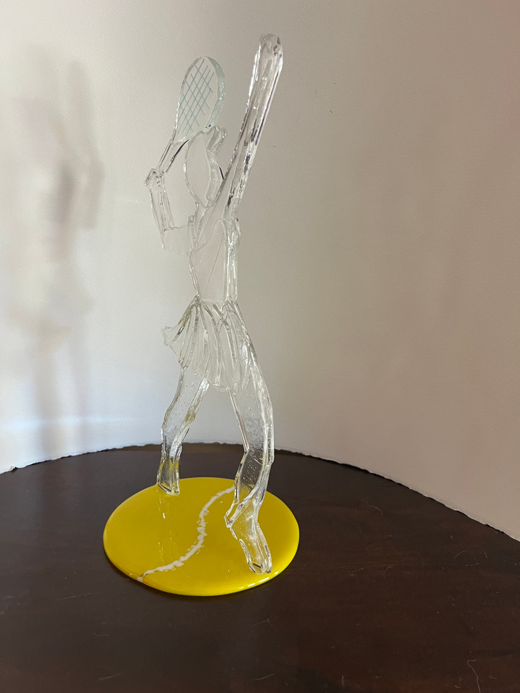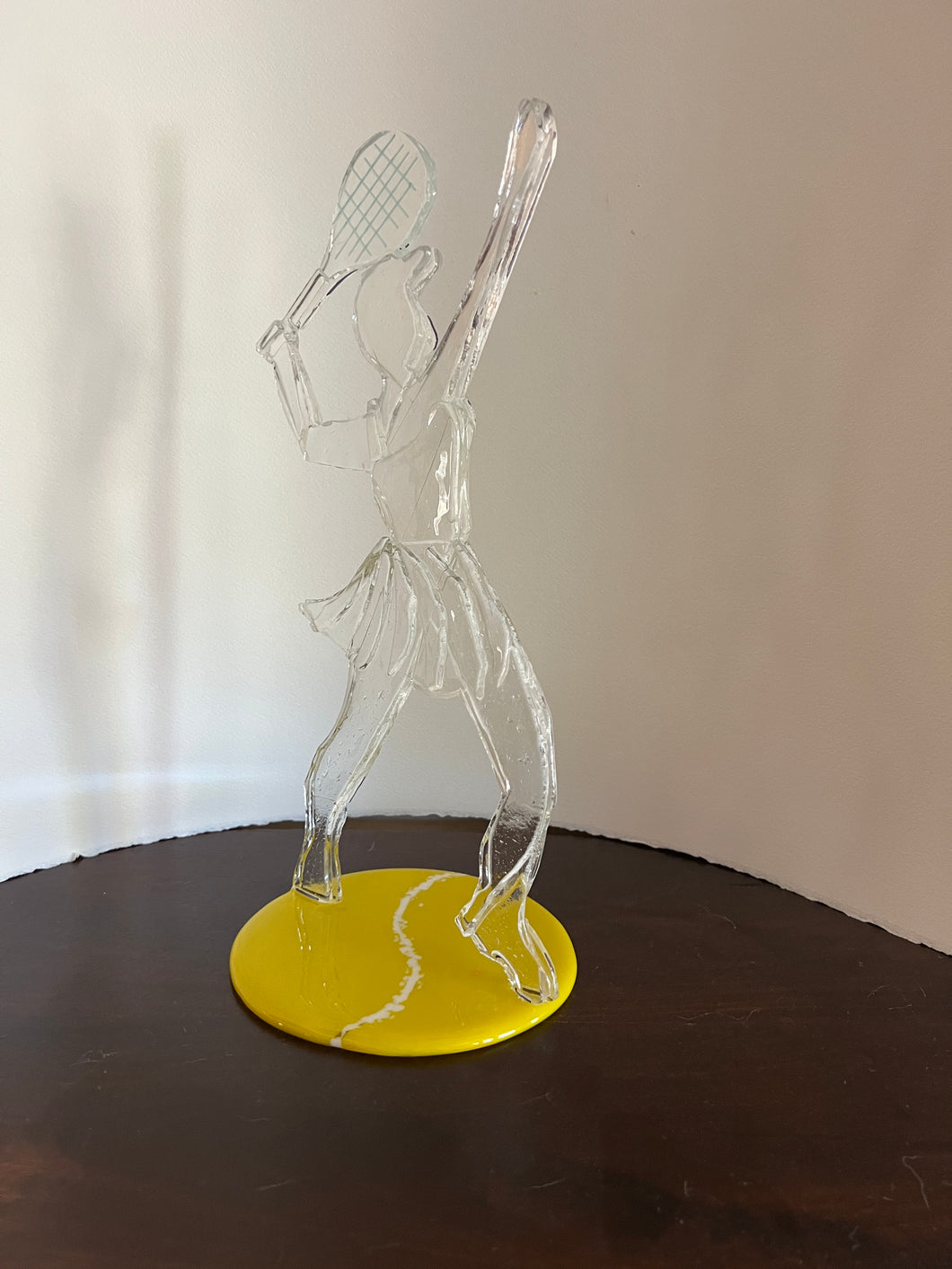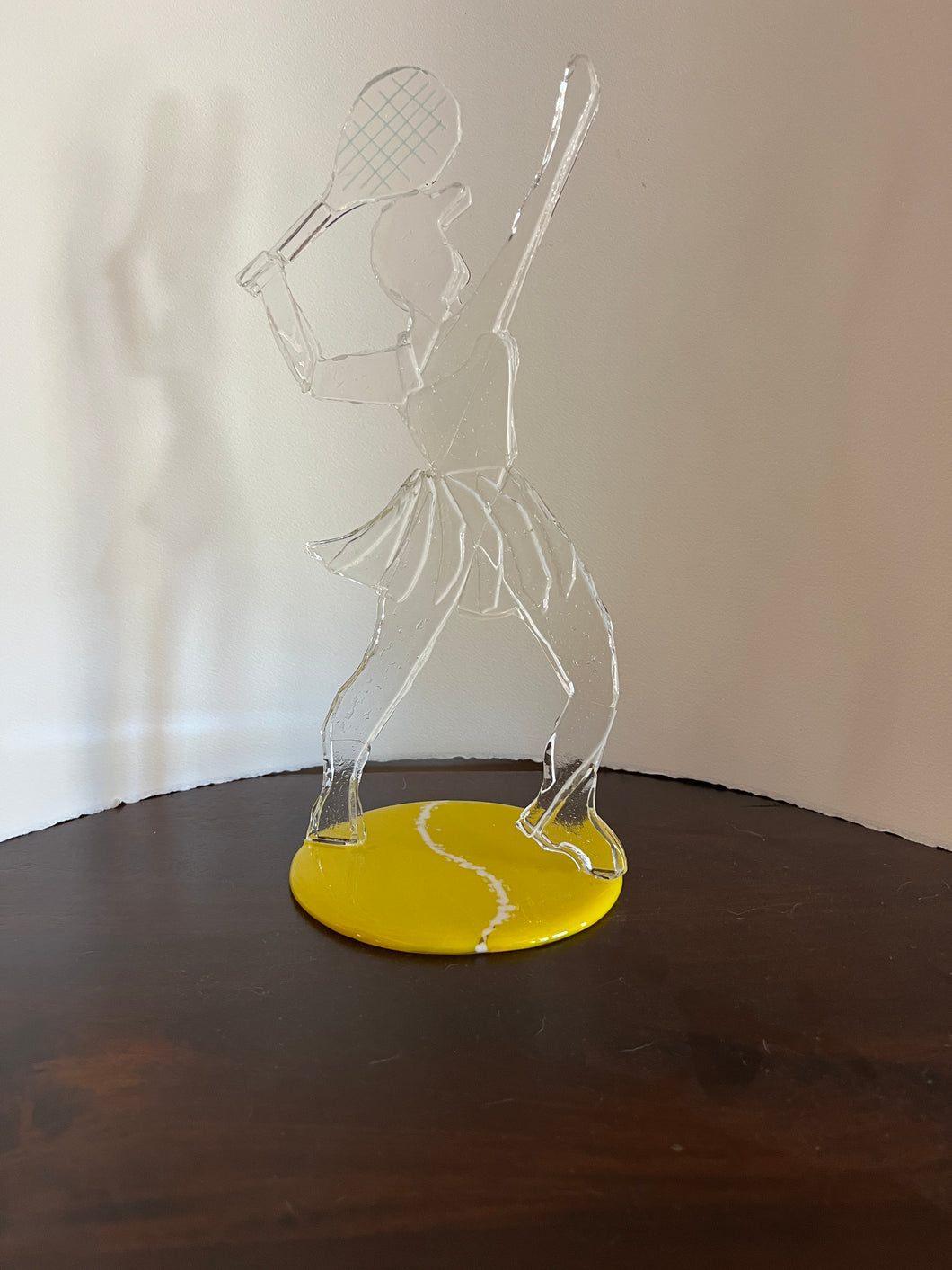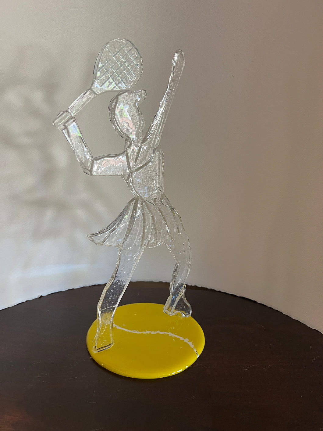 Artist Sandy Drexel sculpts a dynamic figure in glass of a "Lassie" poised to serve a tennis ball. Inspired by her passion for tennis, Sandy captures the athleticism and focus of this 15" tall sculpture, showcasing a girl in her element. The figure is mounted on a 5" diameter round glass base, providing an elegant display. This piece serves as an excellent trophy or a distinguished addition to any collection.
