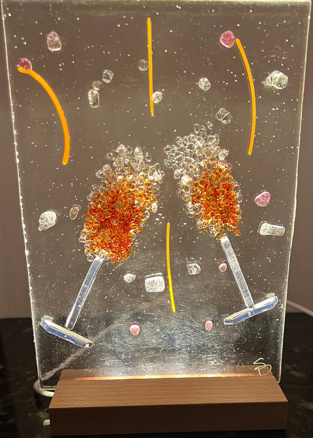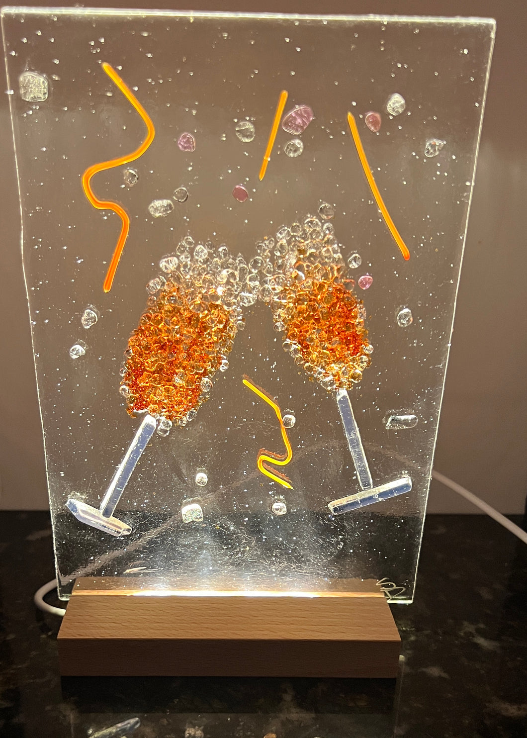Whether you like margaritas or wine this nightlight is perfect for any celebration. Two glasses stand poised on the verge of touching filled with a beverage worthy of celebrations. The glasses sit on a 5" x 7" clear glass panel. Grab up this LED nightlight for your New Years celebration and welcome the new year in style. The integrated LED lighting system, housed within a wooden base, features a simple on/off switch and USB connectivity for seamless power from wall outlets or portable banks. The interchangeable glass panels offer effortless seasonal refreshes.