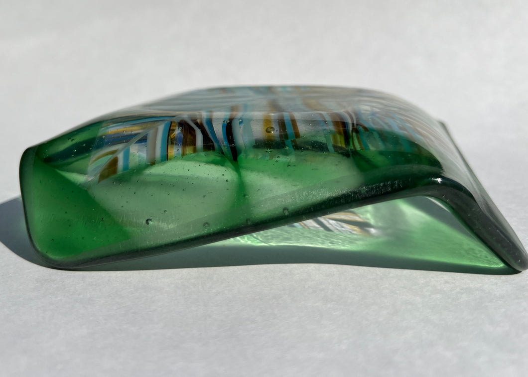 Artist Sandy Drexel explored the interplay of glass to create multiple optical illusions within a single piece. Beginning with carefully arranged stringer triangles and the green frame, she then layered clear glass in diverse shapes and patterns, all fused in one firing process. The 6" origami bowl, featuring delicate bends and folds, elevates the effect by giving the impression of floating glass in three dimensions. Each bowl is signed and crafted to enhance your serving experience while extending the visual illusion.