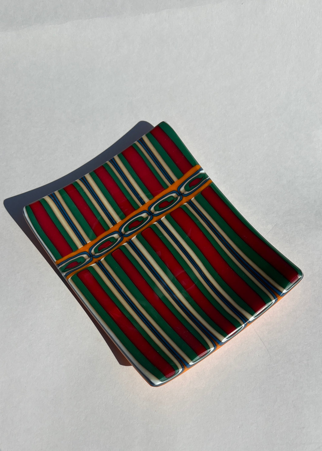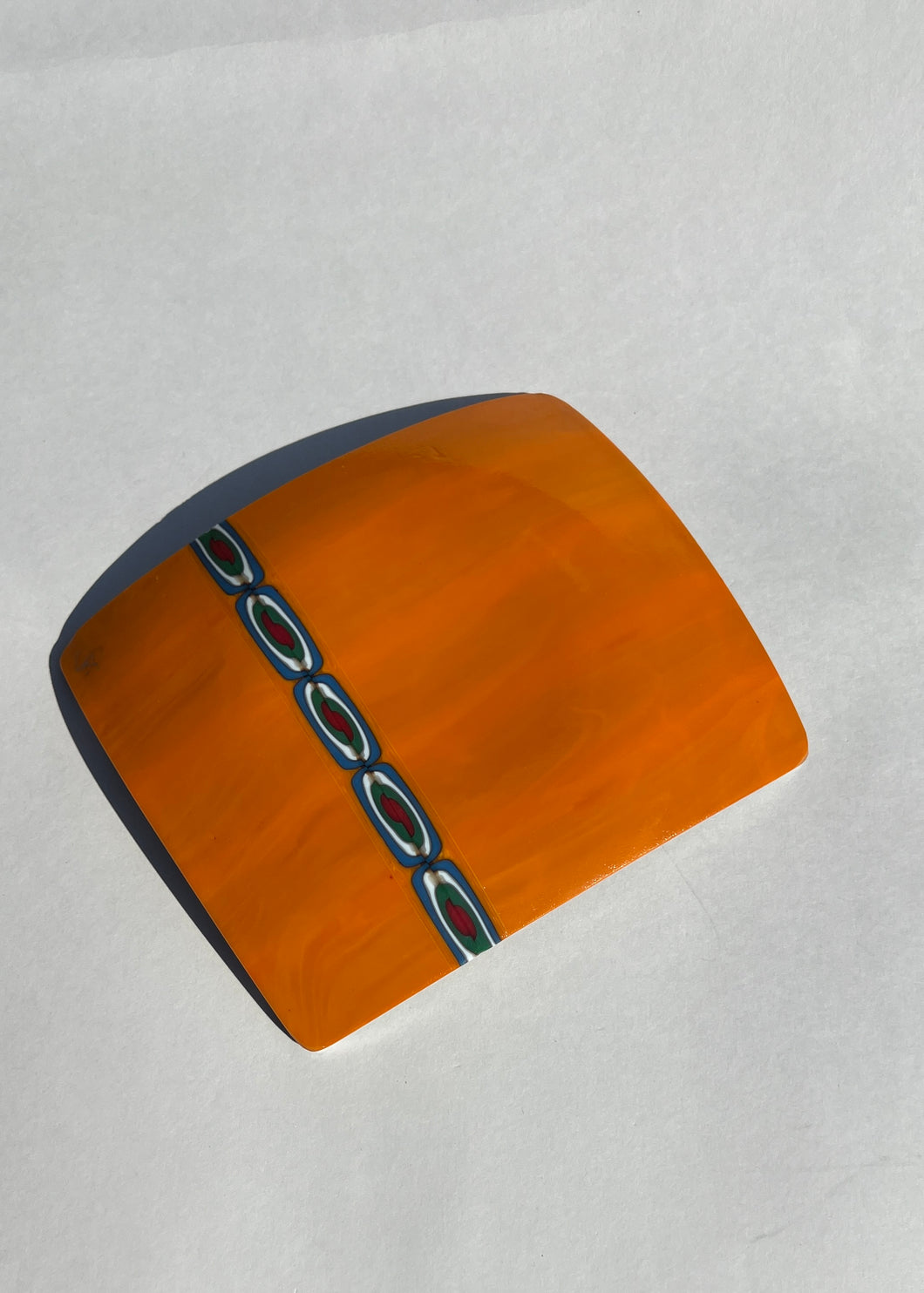 Artist Sandy Drexel designed a vibrant plate by combining glass bars of reactive colors. By layering colors derived from two distinct metal types, dynamic reactions occur between the glass elements. These strips are arranged atop an orange glass base and fired to 1425°. Afterward, the pieces are cut, positioned vertically, and re-fired to 1425°. Once firing is complete, Sandy signs the piece and shapes it into a sushi dish. Please note, this dish is decorative and not intended for food use.